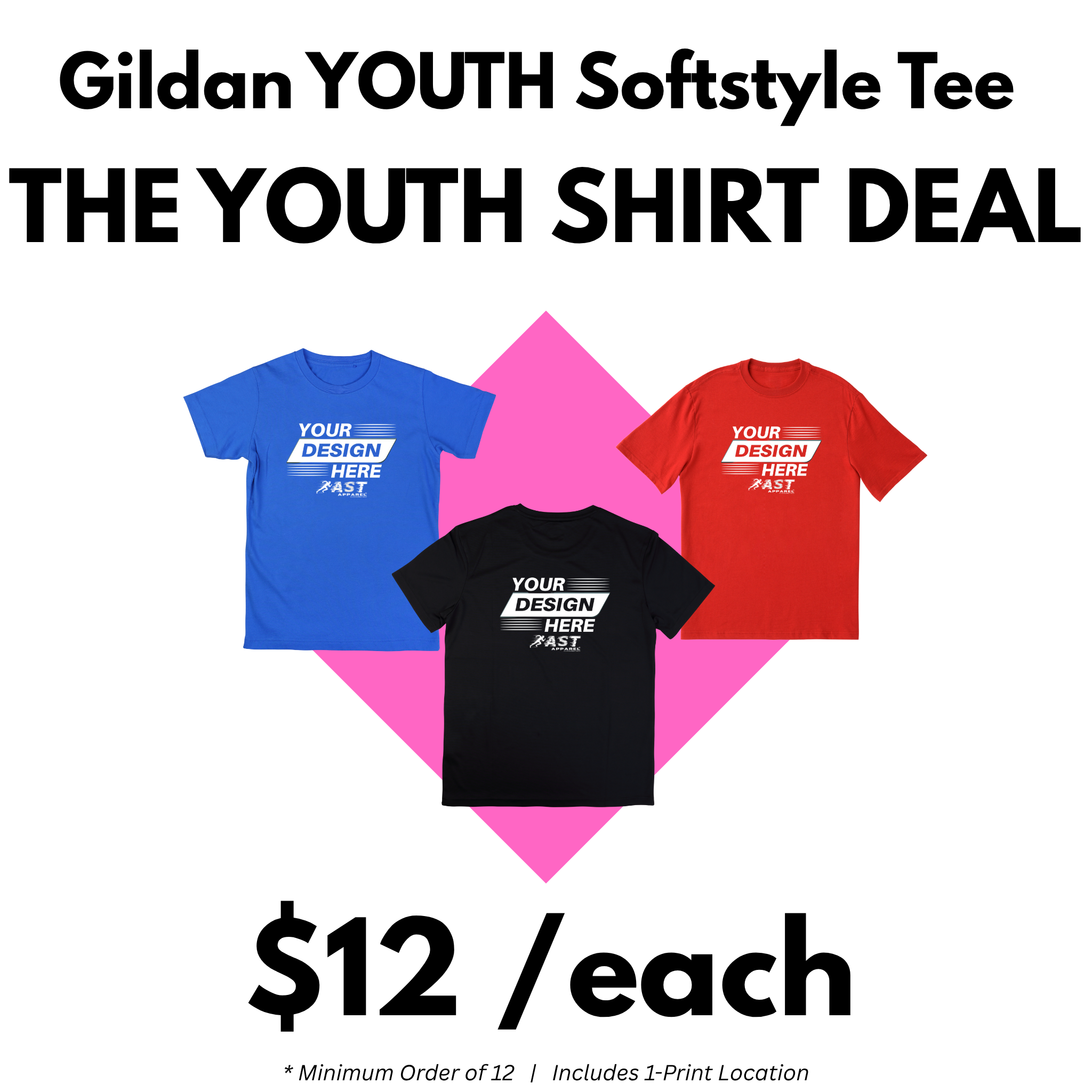 Looking for bulk YOUTH t-shirts? You've come to the right place. Our bulk printed t-shirts feature the popular Gildan Softstyle® t-shirt, made from 100% ringspun cotton. Whether you're promoting your business, brand, event, or showcasing your unique personality, our custom T-shirts bring your vision to life with precision and flair.